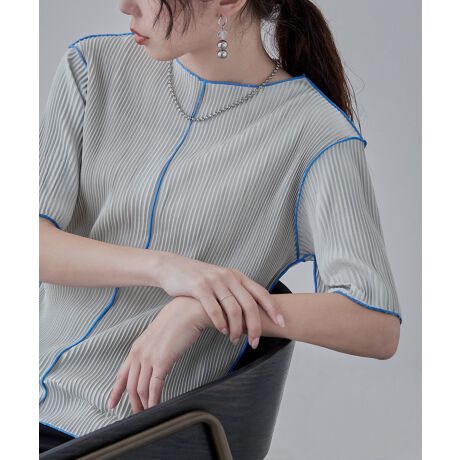 etoll. エトル プリーツの縦ラインが際立ち、首元や袖口は配色パイピングで切り替えた、メリハリ効いたデザイントップス。
