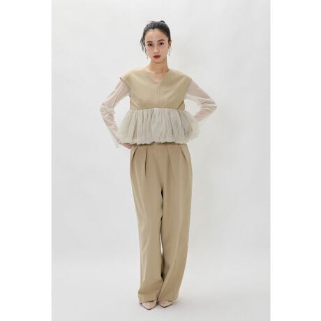 niana ニアナ チュールで仕立てたバルーンペプラムトップスとシアーインナー、ワイドパンツの3ピースセット。