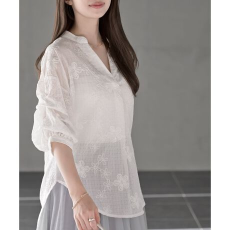 上品なフラワー刺繍のシアーブラウス