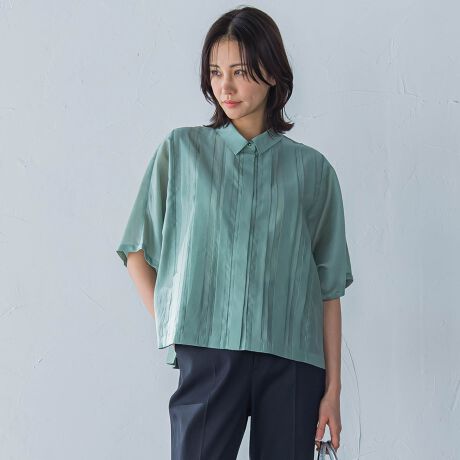 シアー素材ですが、身頃に太めのタックを入れているので透けすぎず、