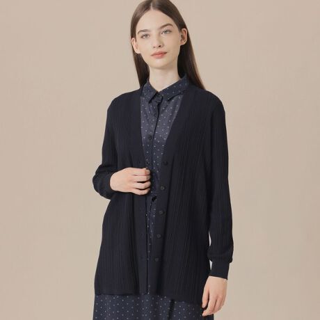 繊細な透け感を生かしたVネックカーディガンです。針抜きの縦ラインで全体的にすっきりときれいに見えるシンプルなデザインに、脇のスリットで軽やかさを演出しています。軽くさっと羽織れ外出時や旅先の持ち運びもしやすい便利なアイテムです。