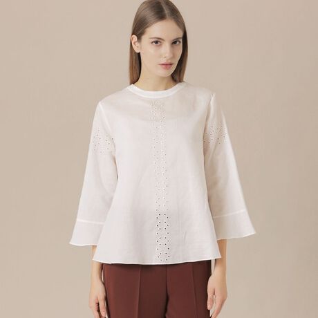 フロントと袖に刺しゅうを施し、1枚で華やかに着映えし清涼感のあるブラウスです。裾に向けて程よく広がるシルエットはテーパードパンツ、ワイドパンツ等、コーディネートの汎用性が高いアイテムです。