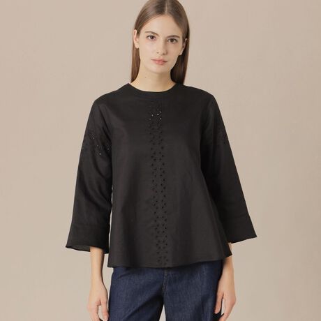 フロントと袖に刺しゅうを施し、1枚で華やかに着映えし清涼感のあるブラウスです。裾に向けて程よく広がるシルエットはテーパードパンツ、ワイドパンツ等、コーディネートの汎用性が高いアイテムです。