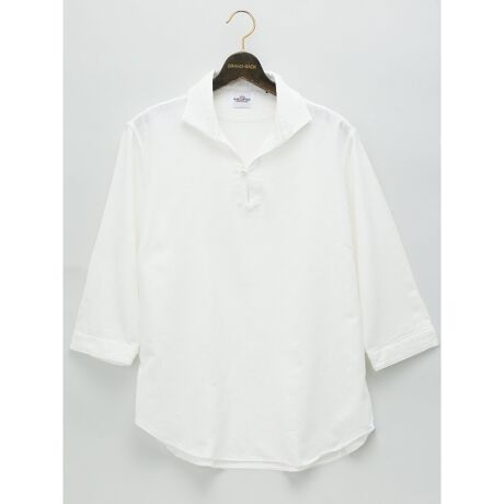 開放的でリラックス感ある、7分袖のカプリシャツです。ボタンは、高級シャツの証である独特な輝きを放つ天然の本貝ボタンです。裾にはガゼットと呼ばれる補強布をつけています。洗濯時等に起きるほつれを防ぎ、スラックスやパンツ内の引き連れを防ぎます。