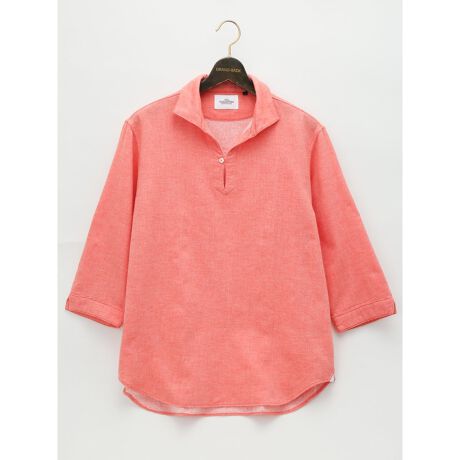 開放的でリラックス感ある、7分袖のカプリシャツです。ボタンは、高級シャツの証である独特な輝きを放つ天然の本貝ボタンです。裾にはガゼットと呼ばれる補強布をつけています。洗濯時等に起きるほつれを防ぎ、スラックスやパンツ内の引き連れを防ぎます。