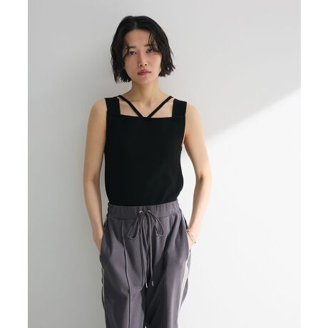 レーヨン混の滑らかなニットで仕立たタンクトップ。程よくフィットするコンパクトなフォルムでインナーアクセントとして活躍してくれる一枚です。太さの異なるストラップを合わせたダブルポイントで前後2WAY仕様出来るのも嬉しいポイント。ヘルシーな抜け感をプラスしてシーズナルに合わせていただける汎用性の高いアイテムです。透け感[なし]