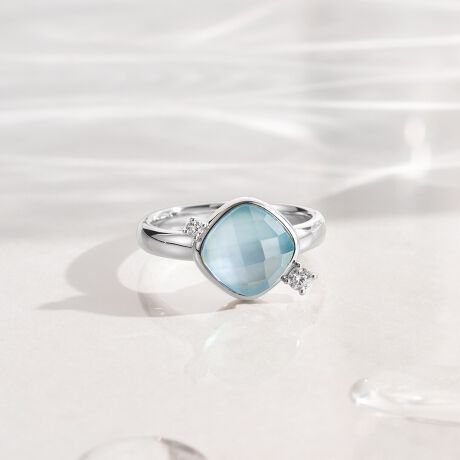 雨上がりの空のようなブルーのストーンとシェルを貼り合わせた光彩の美しさが魅力です。