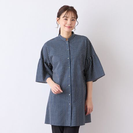 ドロップした袖の切替部分にはギャザーを入れて可愛らしく。チュニック丈でヒップ周りもカバー。ブラウスと着るだけでなく、織りとして着るのもおすすめです。