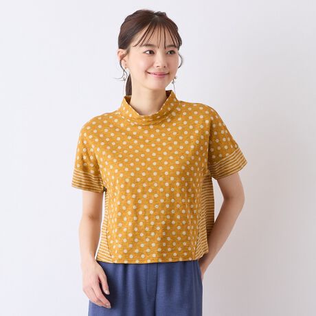 綿100%素材を使用したカットソー素材。ドライタッチで肌触りの良い天竺素材を使用しています。ドットプリントとボーダープリントをドッキングしたデザインTシャツ。袖口・後ろ身頃にボーダーを使用。