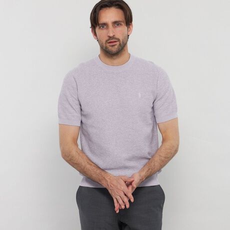 レギュラーフィッティング、クルーネックのTシャツ感覚で着用頂ける半袖ニットです。左胸にダンディマン刺しゅうが入ります。