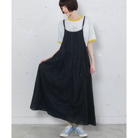 大胆なタックとピコミシンがポイントのキャミソールワンピース。インナー次第でロングシーズン着まわせます。ふんわりと広がるフレアシルエットが女性らしい雰囲気。肩紐で着丈の調節が可能です。両サイドにポケット付き。