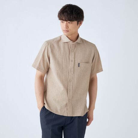 【stanley blacker】【半袖】カッタウェイシャツ ベージュ 無地 コットン リネン混