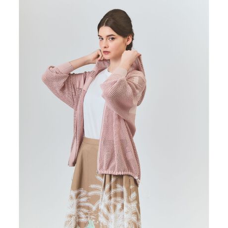 装いを涼やかに演出する、シーズナブルなニットフーディ。軽やかさと清涼感を併せ持ったドライタッチのポリレーヨンの強撚糸を使用。粗めの格子状のメッシュ編とボーダーラインをコンビネーションした事で生まれるすっきりとした表情が、スポーティー&モード感のある雰囲気を演出します。裾はドロストテクニックを入れて、ぎゅっと絞る事で適度な丸みのあるシルエットにもなり、お好みに応じて微調整が可能。ゆったりとしたリラックスシルエットと大きめのフードが、大人のヘルシーなカジュアルスタイルにぴったりです。キャミソールワンピースなどの肌の露出を抑えたい時の羽織りや、インナーにロゴプリントなどを合わせた旬なレイヤードスタイル等、様々な着回しをぜひお楽しみください。