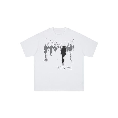 モノクロのデザインが目を引くアートプリントTシャツ。人影をモチーフにしたグラフィックが都会的な印象を与え、シンプルながらも存在感のある一枚。