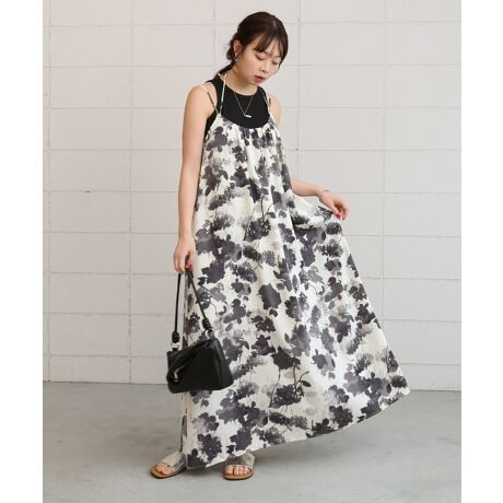 華やかなフラワープリントと華奢見えするショルダーストラップにリボンがアクセントのワンピース。じんわりとにじむような花柄でニュアンス感もたっぷり。2連になったショルダーストラップは首後ろでリボン結びができる仕様で着用した時のフィット感もばっちり。布をたくさん使ったデザインで、動くたび華やかな女性らしいフレアシルエットに。