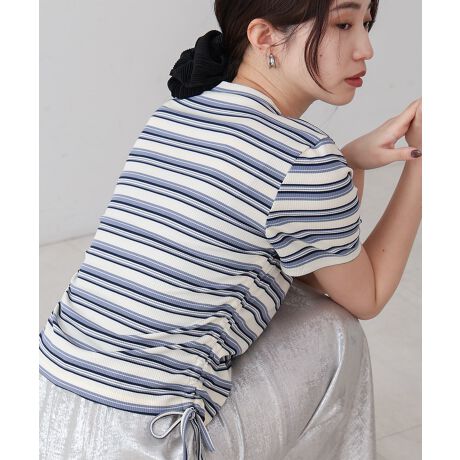 目を引くマルチボーダー柄に、サイドのシャーリングデザインをプラスした、着映え度抜群のTシャツ。程よくフィットするシルエットと、サイドのギャザーが体のラインを美しく見せてくれます。裾のドロスト仕様でシルエットを調整でき、タックインしなくてもこなれ感のある着こなしに。