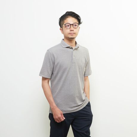 杢糸の表情があるリンクスジャガードのニットライクなジャージ素材を使った半袖ホリゾンタルカラーポロシャツです。