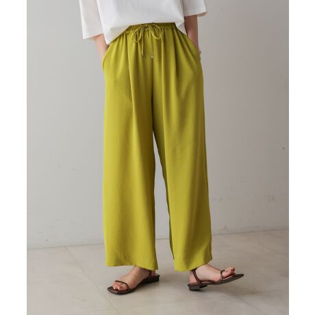 ナチュラルな表情で落ち感とストレッチ感のあるリネンライク素材を使用したリラクシーなムードのあるワイドパンツ。ワイドなウエストギャザーがデザインポイントです。ウエストオールゴム仕様です。しわになりにくく、ストレッチ感のある素材で、カットソーだとカジュアルすぎてという方に◎