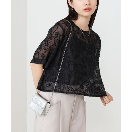 インナーは同系色のキャミを合わせると、オーガンジーの素材感と繊細なコード刺繍を引き立たせてくれます。スラックスやナロースカートに合わせてオケージョンスタイルにも活躍しますが、トップス自体きれいめな印象が強いのであえてデニムやワイドパンツと合わせて甘辛ミックスにするのも◎合わせ方次第でオンオフ対応できる万能ブラウスです。