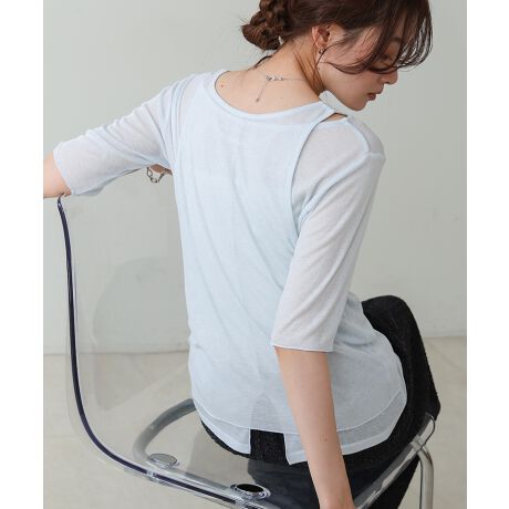 2枚のカットソーがセットになったシアーレイヤードカットソー。レイヤードして着用すると少し肩の部分がスリットのように開くのでトレンディな着こなしが完成します。カットソーのお袖は5分袖になっているので二の腕の気になる部分をカバーしてくれる嬉しい袖丈に!部分的にメロウ始末で仕上げているのでウェーブになった裾などがコーディネートのアクセントになってくれます。衿元が広めに開いた5分袖のカットソーと首が少し詰まったタンクトップは1セットあるととても着まわしが効くアイテムです。そしてなんと!5分袖のカットソーは前後2WAY使用なのでセンターのスリットを前にもってくることも可能。この1セットで何通りもの着方が楽しめる万能なアイテムです!