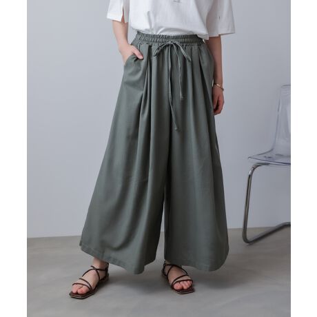 綿とリネンのブレンド生地で肌ざわりよく、まだ暑さの残る時期にも嬉しい素材感。ふわっと広がる、ゆったりワイドなシルエットで動きやすさも◎。ウエストタックが脚のシルエットも綺麗にカバーしてくれます。ウエストはゴム仕様で楽に着て頂けます。
