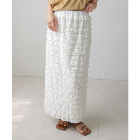 ミニフリルが全体にあしらわれたデザインスカート。ガーリーになりすぎないよう形はシンプルなタイトスカートに。身体のラインを拾わないサイズ感で、幅広い方に綺麗に履いて頂けるスカートに仕上げました。ウエストはリブ仕様なので履きやすく快適な履き心地です。