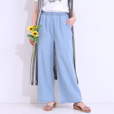 【洗えるS-LL】ウエストゴムが楽ちん さらさらワイドデニム