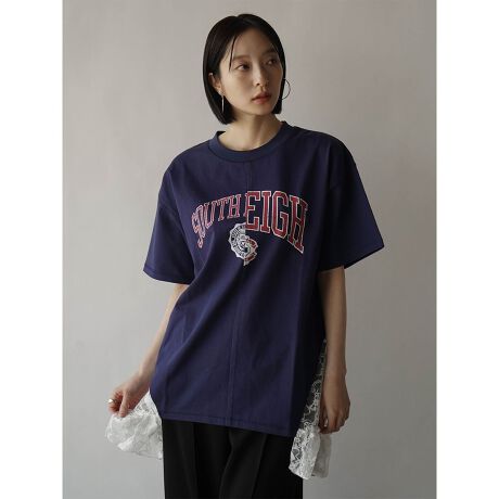 カジュアルなロゴデザインにフラワーレースがポイントのヴィンテージライクなトップス。