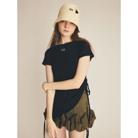 モードなカットラインのアシンメトリーヘムラインがデザインポイントのTシャツ。透け感のあるドライタッチの細番手天竺カットソー生地で作成。シアー生地なのでインナーにバンドゥなどを合わせたレイヤードスタイルを楽しむのがお勧めです。サイドは紐で調整してギャザー分量を調整でき、シルエットの変化を楽しめます。