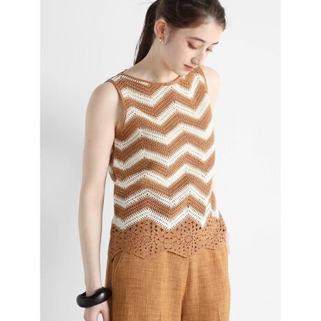 シェブロン柄が目を惹く一枚で着映えるノースリーブプルオーバー。