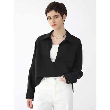 深く入ったスキッパーデザインにドルマンスリーブを掛け合わせた、バランスのとれたシャツブラウス。ゆとりのある袖も、落ち感のある生地が着膨れ感を軽減。デザインインナーなど、レイヤードスタイルの幅も広がる汎用性の高いアイテムです。