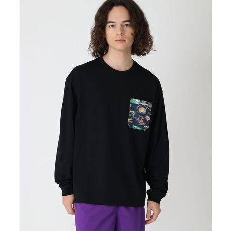 配色ポケットをワンポイントとした長袖Tシャツ。