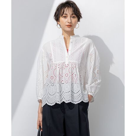 ブザム切り替えの入ったクロップド丈のデザインブラウスです。パーツごとに贅沢に生地刺?を施したこだわりの1枚です。生地刺?がフェミニンな印象を与えてくれるのでデニムを合わせてカジュアルダウンしたスタイリングがおすすめです。カラーは、大人かわいい印象のホワイト(#001)、洗練された雰囲気のネイビー(#075)、シックに着こなせるブラック(#005)の3色展開です。