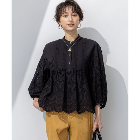 ブザム切り替えの入ったクロップド丈のデザインブラウスです。パーツごとに贅沢に生地刺?を施したこだわりの1枚です。生地刺?がフェミニンな印象を与えてくれるのでデニムを合わせてカジュアルダウンしたスタイリングがおすすめです。カラーは、大人かわいい印象のホワイト(#001)、洗練された雰囲気のネイビー(#075)、シックに着こなせるブラック(#005)の3色展開です。
