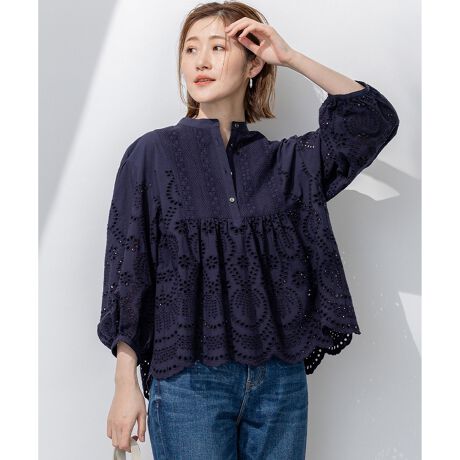 ブザム切り替えの入ったクロップド丈のデザインブラウスです。パーツごとに贅沢に生地刺?を施したこだわりの1枚です。生地刺?がフェミニンな印象を与えてくれるのでデニムを合わせてカジュアルダウンしたスタイリングがおすすめです。カラーは、大人かわいい印象のホワイト(#001)、洗練された雰囲気のネイビー(#075)、シックに着こなせるブラック(#005)の3色展開です。
