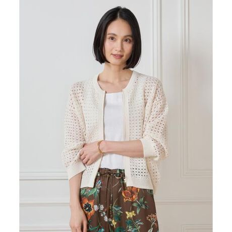 見た目が涼し気な透かし柄のジップアップカーディガンです。透かし柄が大きいのでインナーとのコーディネートも楽しんでいただけます。袖丈は7分袖と初夏に羽織りやすいシルエットにしており、着丈も短めにしているのでワンピースや様々なボトムとの相性も良いです。・水洗い可■サンプル撮影商品■こちらの商品はサンプルでの撮影となっております。実際の商品とは、サイズや色味、素材、デザイン等の仕様が若干変更になる場合がございます。