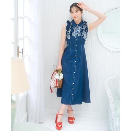 【新色ストライプ柄が登場♪】ボリュームたっぷりのフリルで華やぐ夏色シャツワンピース【Design】・ノースリーブデザインで縦のラインを見せることで、大人っぽいスタイリッシュな雰囲気に♪・胸元から後ろにかけてフェミニンなフリルをあしらい、チュールの透け感が涼しげな仕上がりです。・シャツワンピースらしい襟付きデザインは、きちんと感もプラスしてくれます。・ウエストにはタックをあしらい、後ろのレースアップを絞ることでキュッとくびれたウエストラインを演出できます◎・ウエストバックはゴム&レースアップ仕様。・フロントボタン仕様。【Fabic】・ホワイト、インディゴは程よいしなやかさをもつデニム生地を使用。・ギンガムチェック、ブルーストライプ、ネイビーストライイプはシワになりにくいポリエステル素材を使用。・裏地付き。・ホワイト、インディゴ、ギンガムチェック、ブルーストライプ(New)、ネイビーストライプ(New)の5色展開となります。【Care】ドライクリーニング