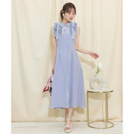 【新色ストライプ柄が登場♪】ボリュームたっぷりのフリルで華やぐ夏色シャツワンピース【Design】・ノースリーブデザインで縦のラインを見せることで、大人っぽいスタイリッシュな雰囲気に♪・胸元から後ろにかけてフェミニンなフリルをあしらい、チュールの透け感が涼しげな仕上がりです。・シャツワンピースらしい襟付きデザインは、きちんと感もプラスしてくれます。・ウエストにはタックをあしらい、後ろのレースアップを絞ることでキュッとくびれたウエストラインを演出できます◎・ウエストバックはゴム&レースアップ仕様。・フロントボタン仕様。【Fabic】・ホワイト、インディゴは程よいしなやかさをもつデニム生地を使用。・ギンガムチェック、ブルーストライプ、ネイビーストライイプはシワになりにくいポリエステル素材を使用。・裏地付き。・ホワイト、インディゴ、ギンガムチェック、ブルーストライプ(New)、ネイビーストライプ(New)の5色展開となります。【Care】ドライクリーニング