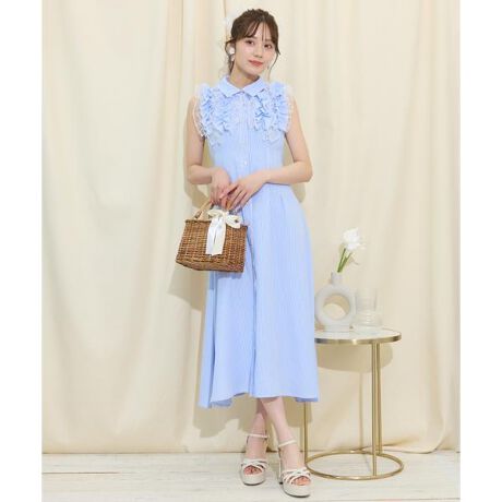 【新色ストライプ柄が登場♪】ボリュームたっぷりのフリルで華やぐ夏色シャツワンピース【Design】・ノースリーブデザインで縦のラインを見せることで、大人っぽいスタイリッシュな雰囲気に♪・胸元から後ろにかけてフェミニンなフリルをあしらい、チュールの透け感が涼しげな仕上がりです。・シャツワンピースらしい襟付きデザインは、きちんと感もプラスしてくれます。・ウエストにはタックをあしらい、後ろのレースアップを絞ることでキュッとくびれたウエストラインを演出できます◎・ウエストバックはゴム&レースアップ仕様。・フロントボタン仕様。【Fabic】・ホワイト、インディゴは程よいしなやかさをもつデニム生地を使用。・ギンガムチェック、ブルーストライプ、ネイビーストライイプはシワになりにくいポリエステル素材を使用。・裏地付き。・ホワイト、インディゴ、ギンガムチェック、ブルーストライプ(New)、ネイビーストライプ(New)の5色展開となります。【Care】ドライクリーニング