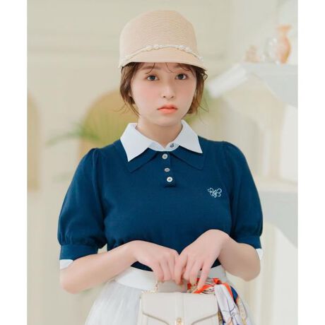 シャツブラウス×ポロニットのレイヤード風トップス【Design】・カジュアルテイストなポロシャツに、シャツ襟&カフスをドッキングしたプルオーバー。・ダブルカラーデザインと配色使いできちんと感も兼ね備えた仕上がり♪・胸元にはロゴ刺繍をあしらい、フォーマルなエッセンスもプラスしました!・フェミニンなフレアスカートやチュールスカートとのコーディネートはもちろん、デニムパンツを合わせてカジュアルな着こなしも◎・袖にはボリュームをもたせることで女性らしいフェミニン感も表現してくれます。・ウエストインしやすいコンパクトな着丈感のアイテムです。・フロントボタン仕様。【Fabic】・薄手で軽い着心地のニット生地を使用。・シャツ部分は程よくハリ感のある生地を使用。・ご自宅でお手入れが出来るのも嬉しいポイント♪・ホワイト、ピンク、グレー、ネイビーの4色展開となります。【Care】手洗い可能