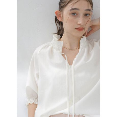・首元、袖口のシャーリングが可愛らしいブラウス