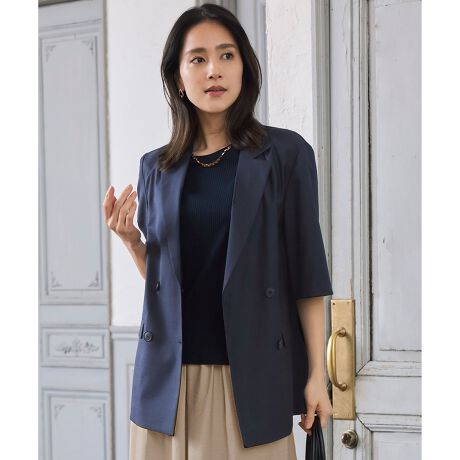 ゆったりとしたバランス感でオンオフ活躍する半袖ジャケット■デザインボクシーなシルエットが特徴のダブル前のハーフスリーブジャケットです。襟やラペルはきちんとしたジャケットのデザインですが、ボクシーなシルエットや長めの半袖で今年らしいゆったりとしたバランスに仕上げています。通勤にもカジュアルなコーディネートにも相性が良く、前を開けて着て頂いたり、肩に羽織って頂くなど幅広い着こなしをお楽しみ頂けます。■素材膨らみ感のあるポリエステル糸を使用しております。ツイル組織に織り、追い込んで仕上げることで、ポリエステルながらナチュラルなストレッチ性が特徴です。仕上げはタンブラー加工で、ナチュラルな表情に仕上げており、適度にシャリ感もあります。