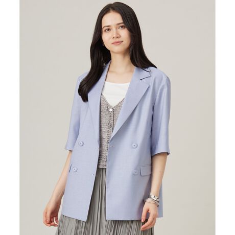 ゆったりとしたバランス感でオンオフ活躍する半袖ジャケット■デザインボクシーなシルエットが特徴のダブル前のハーフスリーブジャケットです。襟やラペルはきちんとしたジャケットのデザインですが、ボクシーなシルエットや長めの半袖で今年らしいゆったりとしたバランスに仕上げています。通勤にもカジュアルなコーディネートにも相性が良く、前を開けて着て頂いたり、肩に羽織って頂くなど幅広い着こなしをお楽しみ頂けます。■素材膨らみ感のあるポリエステル糸を使用しております。ツイル組織に織り、追い込んで仕上げることで、ポリエステルながらナチュラルなストレッチ性が特徴です。仕上げはタンブラー加工で、ナチュラルな表情に仕上げており、適度にシャリ感もあります。