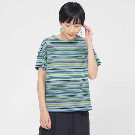 ボートネックでフレンチスリーブのマルチボーダーTシャツ。細かいピッチの多色ボーダーが、コーディネートを華やかにみせます。程よくゆとりのあるシルエットで、快適な着心地にこだわりました。