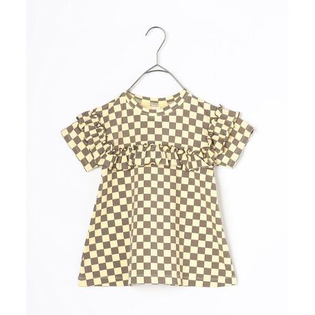 ポップなメロウの配色と総柄がかわいいフリルTシャツ。