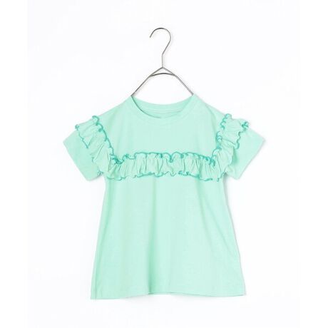ポップなメロウの配色と総柄がかわいいフリルTシャツ。