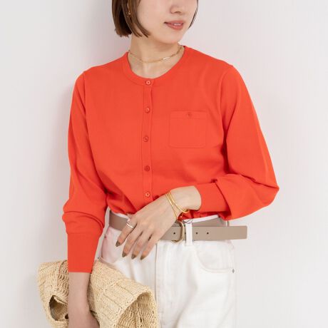 ・胸元の飾りポケットがポイントのコンパクトなクルーネックカーディガン