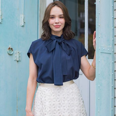 シンプルながら華やかな印象へ導いてくれるビッグボウタイブラウス。