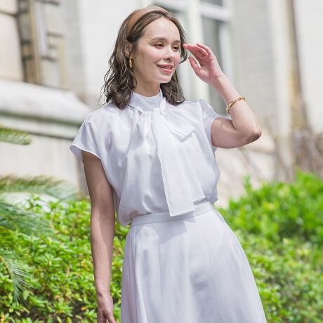 シンプルながら華やかな印象へ導いてくれるビッグボウタイブラウス。