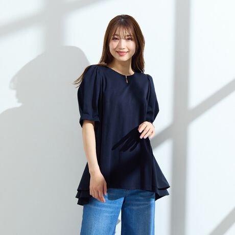 接触冷感性、紫外線防止効果のある機能性素材で夏も快適に着られるペプラムカットソー。